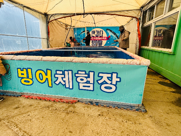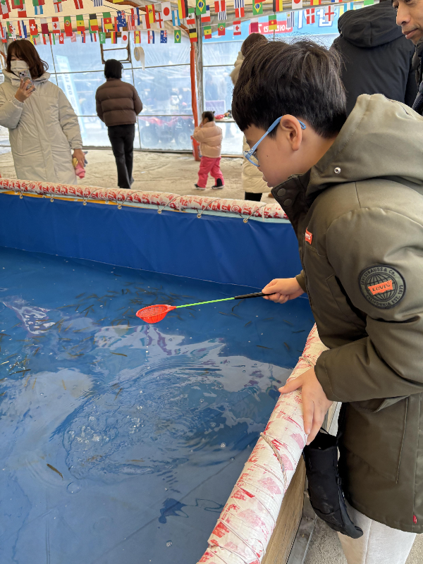눈썰매 쉬는 시간엔 빙어잡기도 했어요. 귀여운 빙어들을 작은 뜰채로 잡는 재미가 쏠쏠했는데요, 아이들이 3분씩 시간을 정해서 누가 더 많이 잡나 게임도 하면서 즐겁게 놀았어요. 작은 아이들을 위한 수족관도 따로 있어서 더욱 좋았답니다.