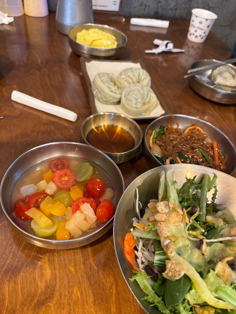 그런데 주문한 음식이 나오기 전에 샐러드와 만두가 기본 반찬으로 나왔습니다. 왕만두를 반찬이라고 표현해도 될까요? ^^