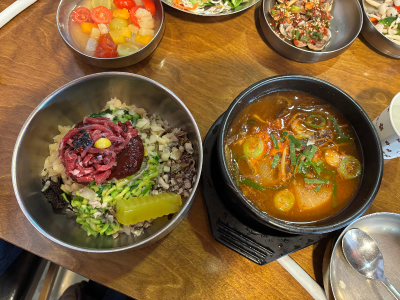 육회비빔밥과 갈비탕에는 도라지무침, 깍두기, 꼬막무침 등 다양한 기본 찬이 나와서 정말 푸짐하게 즐길 수 있었습니다.